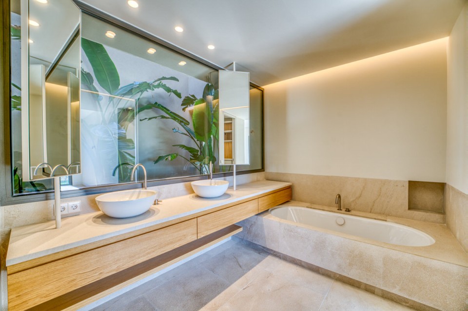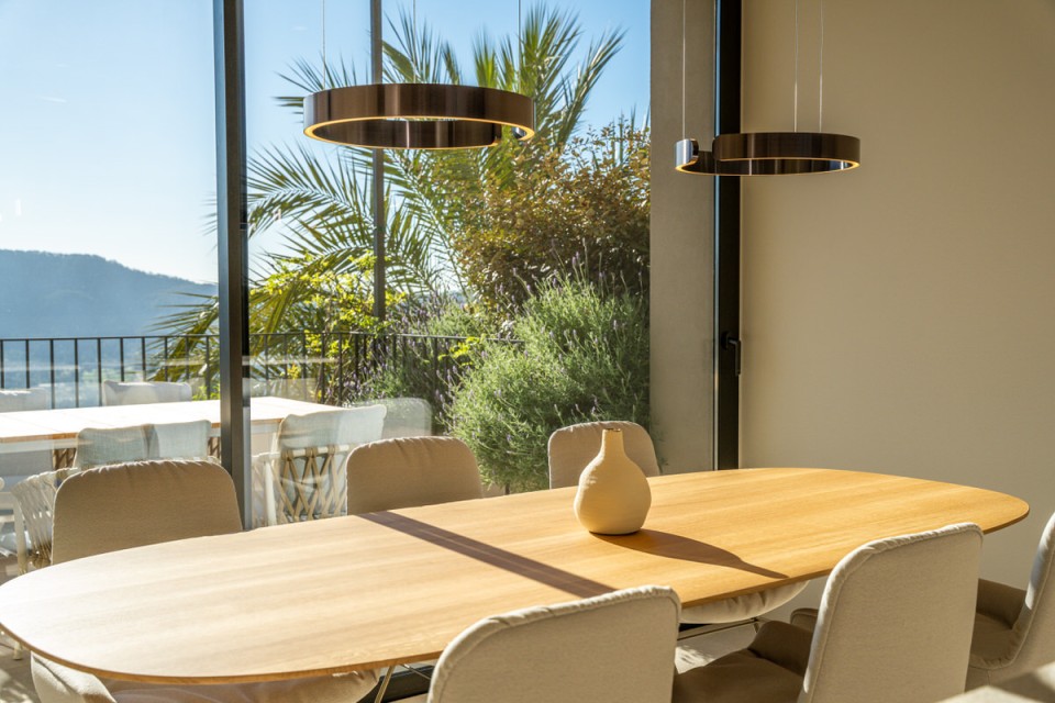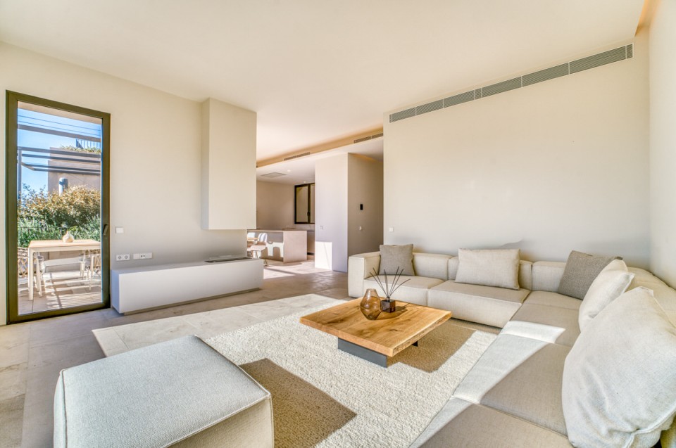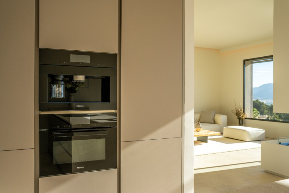 Für dieses Appartement oberhalb von Port d'Andratx haben wir eine reduzierte Möblierung entwickelt, die den Ort als Maßstab nimmt: aus dem Sandton der Fassaden, dem Weiß des Lichts, der Stille, die hier oben herrscht. Die Planung und Auswahl entstanden vollständig in unserem Haus. Alles bleibt im Hintergrund – die Aussicht nicht. Cremefarbene Stoffe, die mit dem Putz der Fassaden sprechen. Teakholz, das der Terrasse Wärme gibt, ohne zu dominieren. Ein Sofa, das tief genug ist, um wirklich anzukommen.